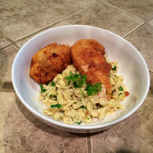 Ingredients 4 chicken breasts or whole chicken cut up 1 cupFlour salt and pepper 3 Eggs 2 tablespoons Water 1cup Flour 1 cup panko bread crumbs (or crushed Ritz crackers) oil for frying Directions: You will have 3 bowls to dip chicken in. 1st bowl- flour with salt and pepper; 2nd bowl- Eggs and …